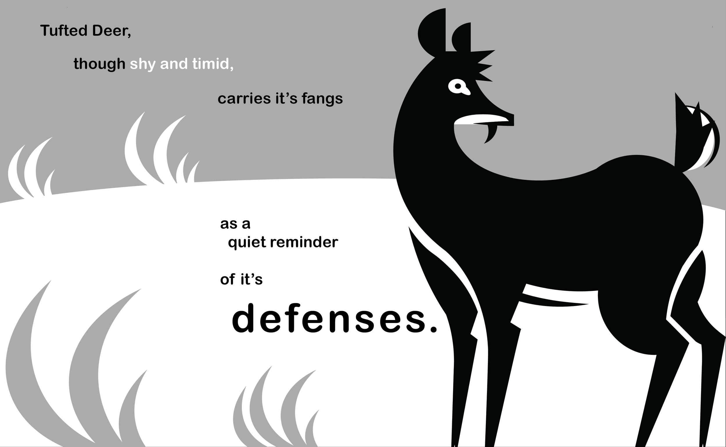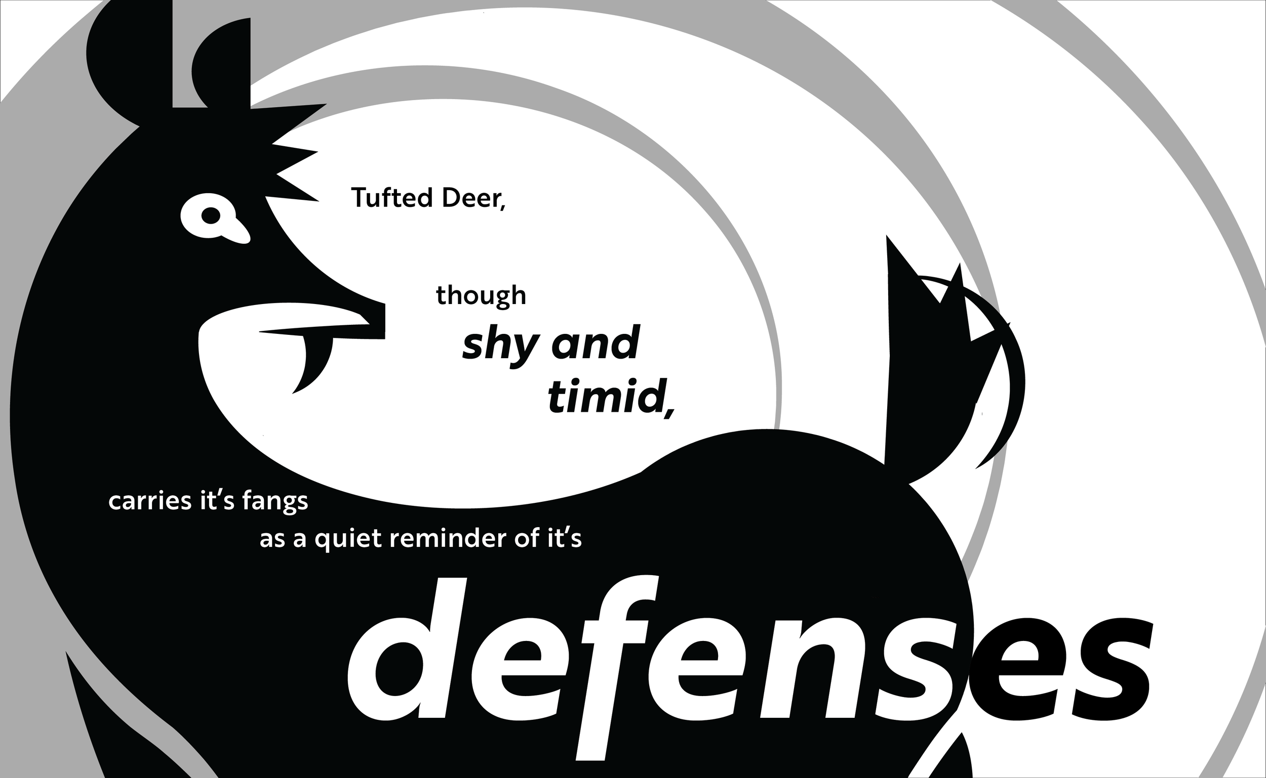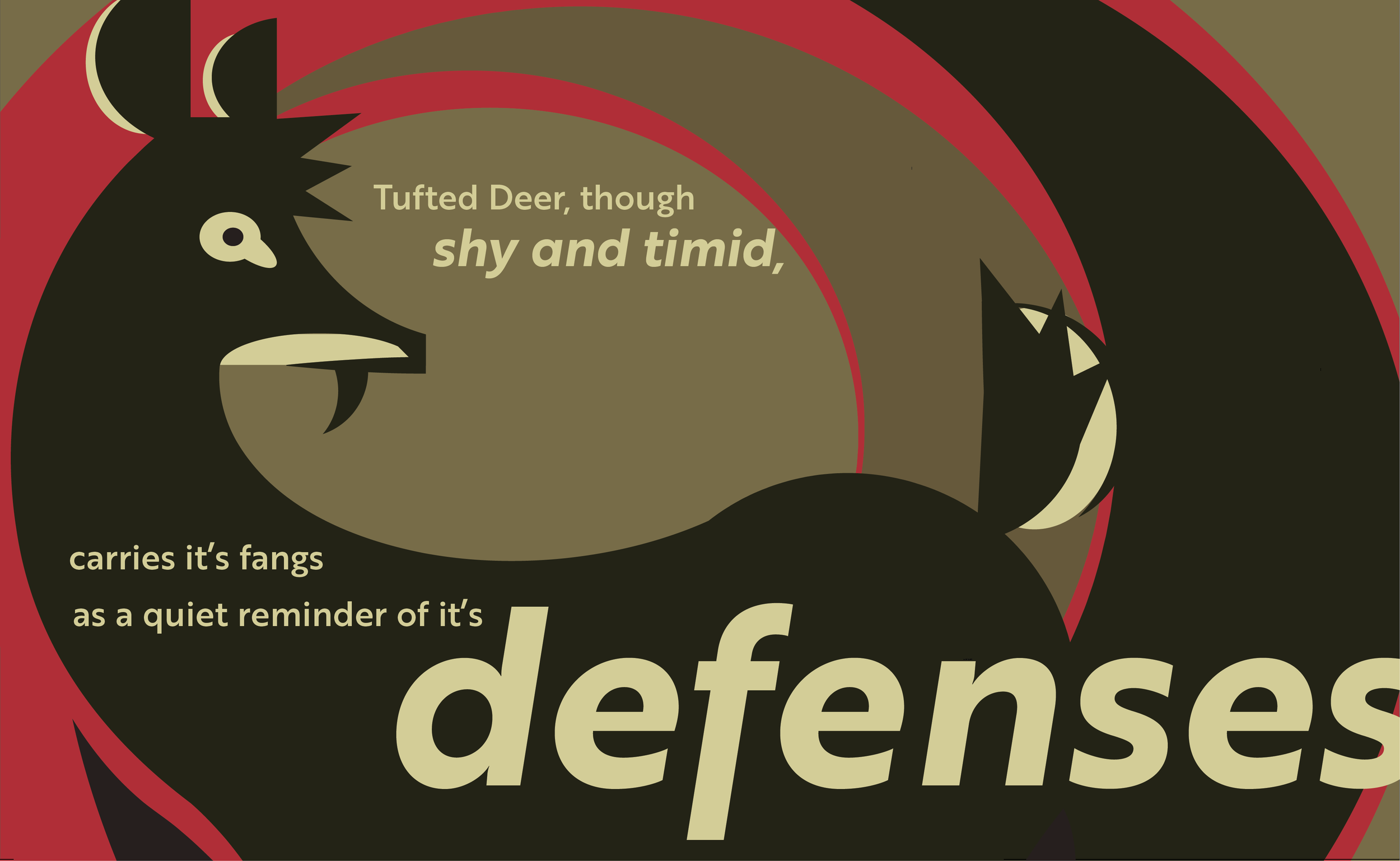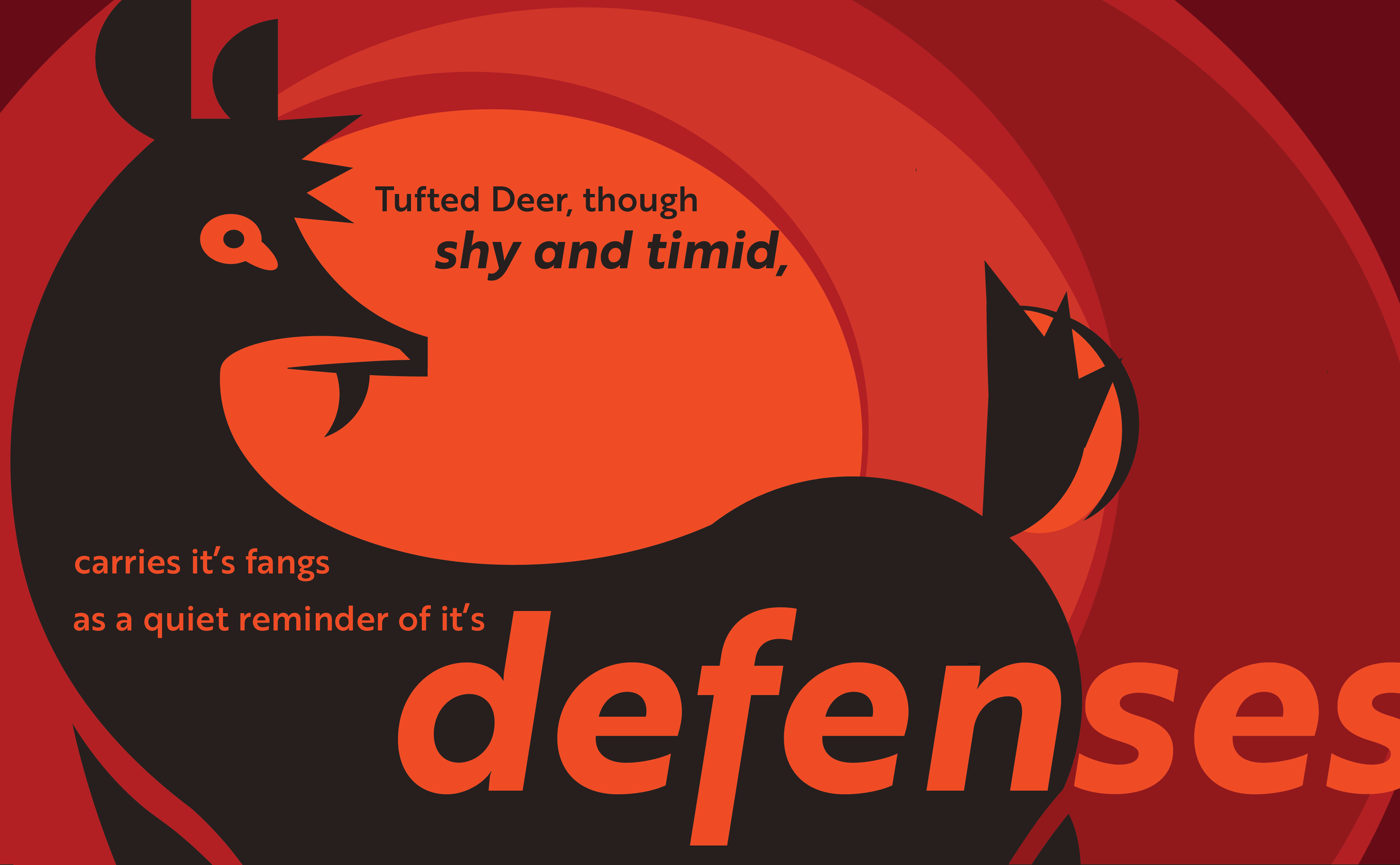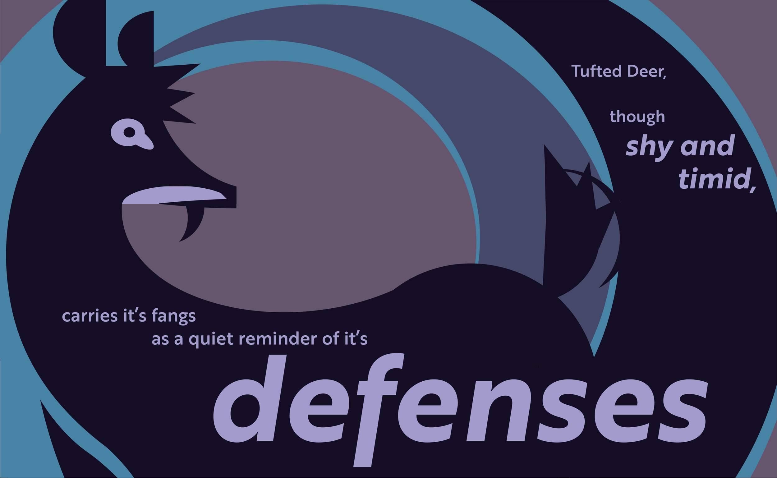 The goal of this project was to create a graphic representation of an animal of my choosing, the tufted deer, based on inherent shapes and structures, emphasizing key physical and associative attributes, and to then incorporate the graphic into a full composition using color and typography.