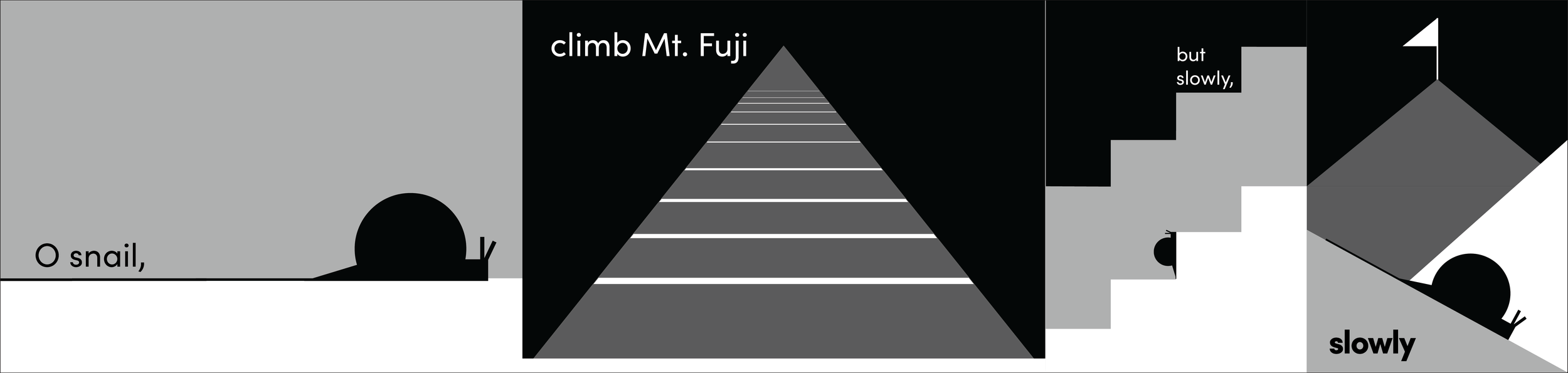 The goal of this project was to graphically interpreting a haiku through an eight page zine. The poem I chose to represent was “O snail” by Kobayashi Issa.